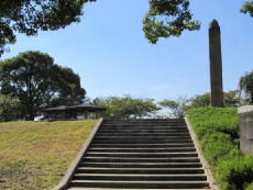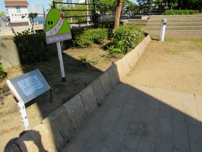 大阪・海遊館、天保山観覧車 北東にある。 日本一低い山として有名な標高4.53mの「天保山」がある天保山公園へ 山頂には記念碑「明治天皇観艦之所碑」 隣に日本一低い山 山頂の標識、埋もれた三角点 公園は遊歩道・ベンチで整備され桜の名所です。 公園の頭上を天保山大橋、正面入口 左右の側面には江戸時代の様子が描かれた浮世絵の陶板が迎えてくれます。